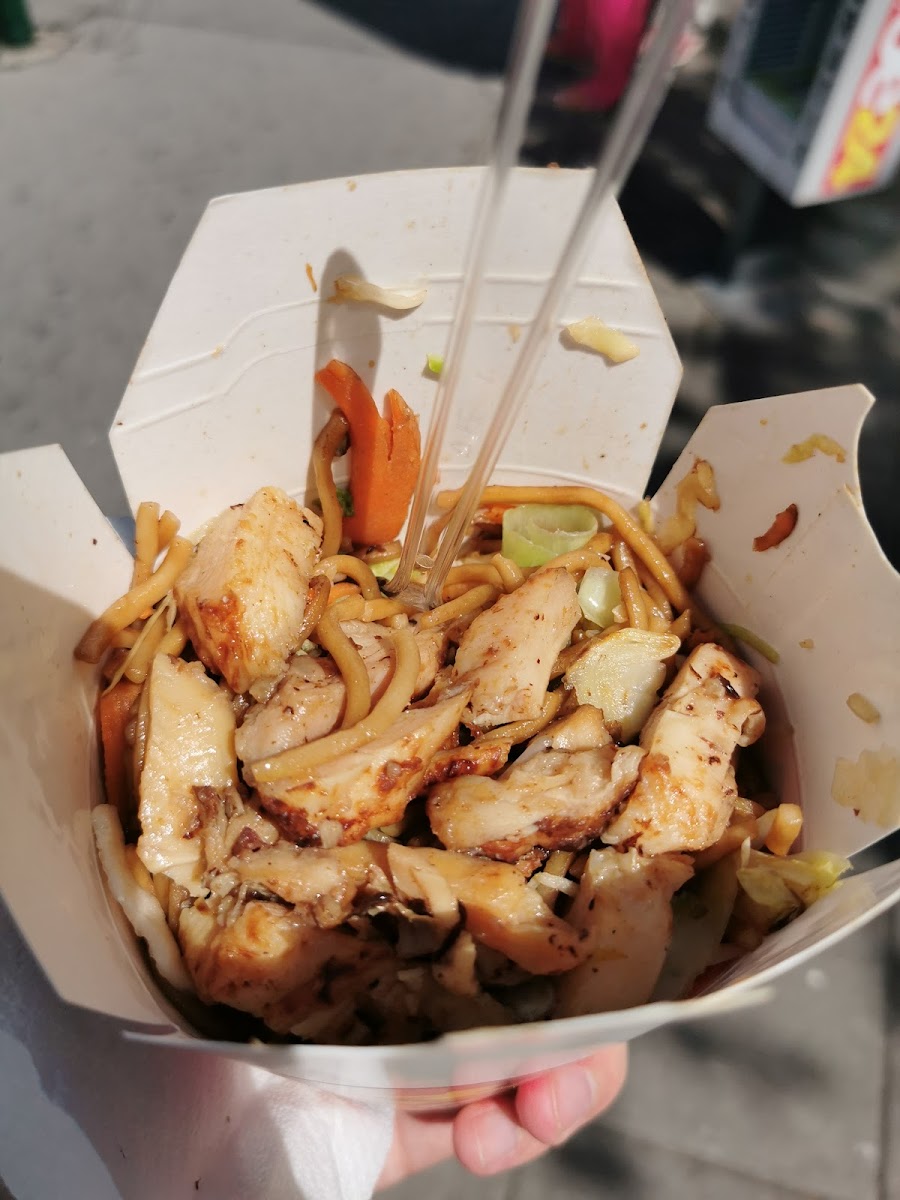 Noodles are exactly what you would expect from them - tasty, fast, filling. Meat is cut up into nice, bite size pieces; it's definitely not raw while not being overdryed. Shrimps are also satisfying - big and wide. I would take a few points of for the environment - there's no tables, just some public benches. Nothing special (not for the bad nor the good side). Prices are really fair.